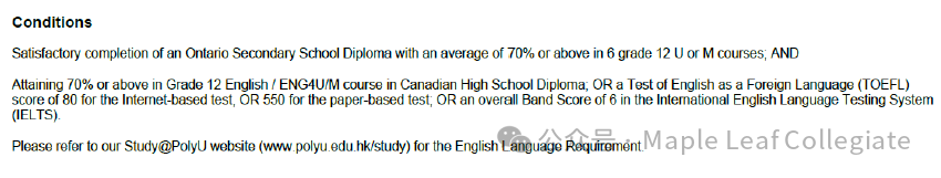 以我们过往的经验为例,这是香港理工大学的有条件录取的要求: